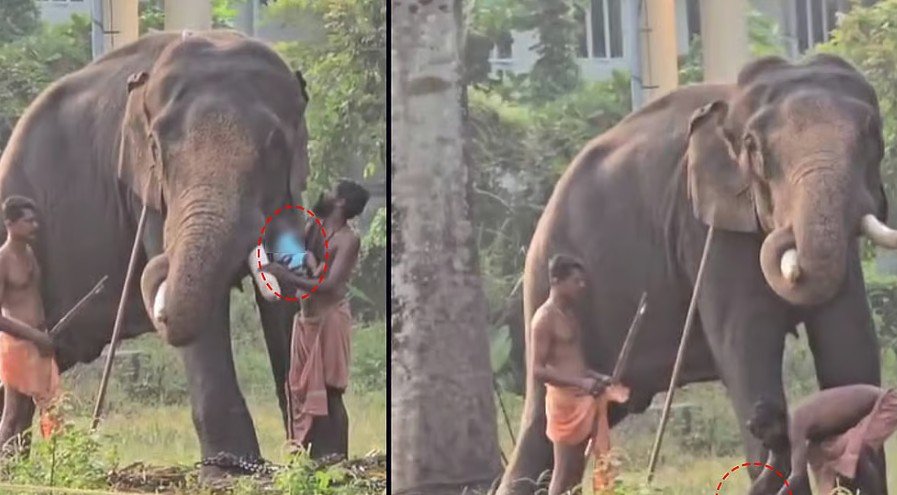 കൊലയാളി ആനയുടെ കൊമ്പിൽ 5 മാസം മാത്രം പ്രായമുള്ള കുഞ്ഞിനെ വെച്ച് പാപ്പാന്‍റെ അഭ്യാസം : നിലത്ത് വീണ് കുഞ്ഞു ; രക്ഷപെട്ടത് തലനാരിഴയ്ക്ക്