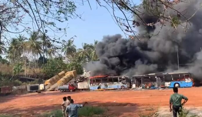 വിമാനത്താവളത്തിന് സമീപത്തെ ഒഴിഞ്ഞ പ്രദേശത്ത് നിർത്തിയിട്ടിരുന്ന ബസുകൾക്കാണ് തീപിടിച്ചത്. നിലവിൽ സർവീസ് നടത്താത്ത ബസുകളാണിവയെന്നാണ് വിവരം.