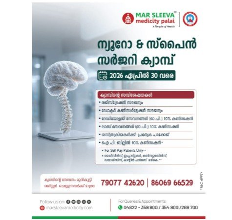 പാലാ : മാർ സ്ലീവാ മെഡിസിറ്റിയിൽ ന്യൂറോ ആൻഡ് സ്പൈൻ സർജറി ക്യാമ്പ് ഏപ്രിൽ 30 വരെ നടത്തും. നാഡീവ്യൂഹവും, നട്ടെല്ല് സംബന്ധവുമായ രോഗങ്ങൾക്ക് വിദഗ്ധ പരിശോധനയും ചികിത്സയും ക്യാമ്പിൽ പങ്കെടുക്കുന്നവർക്ക് ലഭ്യമാണ്.
