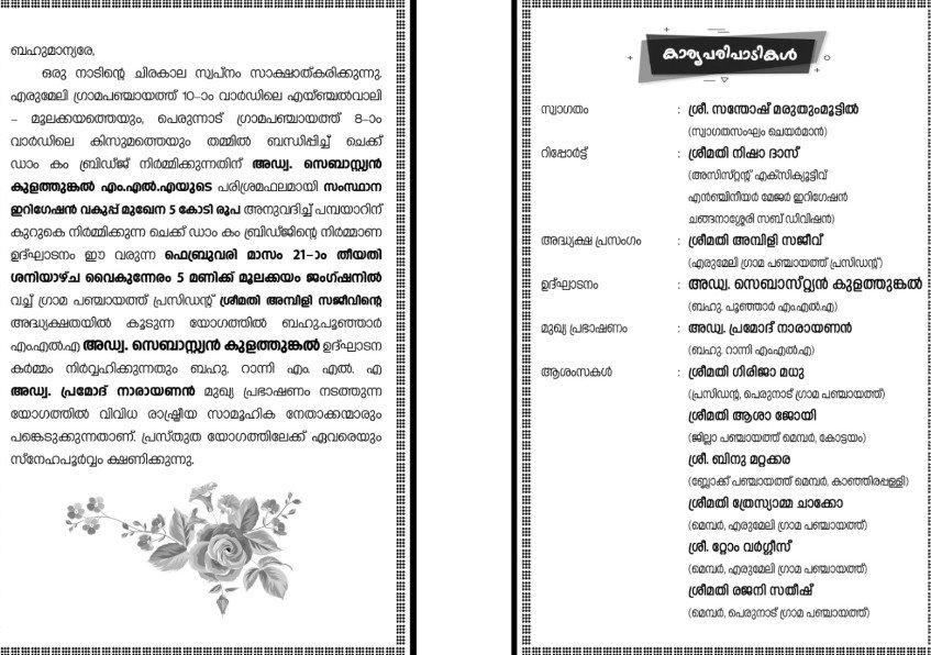 എരുമേലി ഗ്രാമപഞ്ചായത്ത് പ്രസിഡന്റ് അമ്പിളി സജീവൻ അധ്യക്ഷത വഹിക്കും. റാന്നി എംഎൽഎ പ്രമോദ് നാരായൺ മുഖ്യപ്രഭാഷണം നടത്തും. പെരുനാട് ഗ്രാമപഞ്ചായത്ത് പ്രസിഡന്റ് ഗിരിജ മധു,കോട്ടയം ജില്ലാ പഞ്ചായത്ത് മെമ്പർ ആശാ ജോയി, കാഞ്ഞിരപ്പള്ളി ബ്ലോക്ക് പഞ്ചായത്ത് മെമ്പർ ബിനു മറ്റക്കര, ഗ്രാമപഞ്ചായത്ത് അംഗങ്ങളായ ത്രേസ്യാമ്മ ചാക്കോ, ടോം വർഗീസ്, രജനി സതീഷ്, രതീഷ് മടുക്കോലി , അനിത പി. ജോസ്, സ്വാഗതസംഘം ചെയർമാൻ സന്തോഷ് മരുതുംമൂട്ടിൽ , രാഷ്ട്രീയപാർട്ടി നേതാക്കളായ ടി.ഡി സോമൻ, മുരളി, സക്കറിയ ഡൊമിനിക്ക് ചെമ്പകത്തുങ്കൽ, റെജി അമ്പാറ, ബിനോ ചാലക്കുഴി , സന്തോഷ് പാലമൂട്ടിൽ, ഇറിഗേഷൻ വകുപ്പ് അസിസ്റ്റന്റ് എക്സിക്യൂട്ടീവ് എൻജിനീയർ നിഷാ ദാസ്, അസിസ്റ്റന്റ് എൻജിനീയർ ജോജു സി. കുര്യൻ തുടങ്ങിയവർ പ്രസംഗിക്കും.