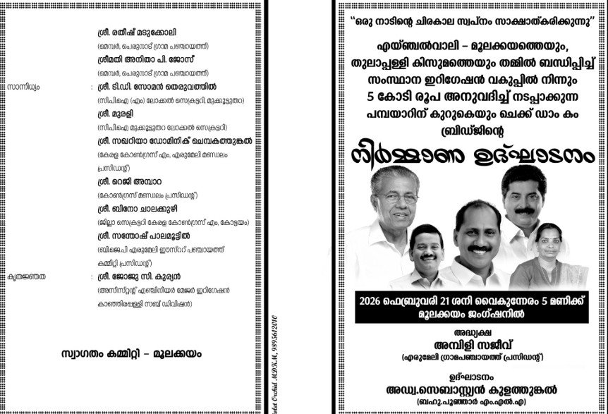 എരുമേലി ഗ്രാമപഞ്ചായത്ത് പത്താം വാർഡിലെ മൂലക്കയത്തെയും, പെരുനാട് ഗ്രാമപഞ്ചായത്ത് എട്ടാം വാർഡ് കിസുമത്തെയും തമ്മിൽ ബന്ധിപ്പിച്ച് സംസ്ഥാന ഇറിഗേഷൻ വകുപ്പിൽ നിന്നും 5 കോടി രൂപ വിനിയോഗിച്ച് പമ്പയാറിന് കുറുകെ നിർമിക്കുന്ന ചെക്ക് ഡാം കം ബ്രിഡ്ജിന്റെ നിർമ്മാണ ഉദ്ഘാടനം 21-)o തിയതി വൈകിട്ട് 5 മണിക്ക് മൂലക്കയം ജംഗ്ഷനിൽ അഡ്വ. സെബാസ്റ്റ്യൻ കുളത്തുങ്കൽ എംഎൽഎ നിർവഹിക്കും.