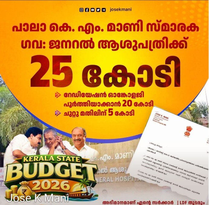 കോട്ടയം: സംസ്ഥാന ബജറ്റില് പാലാ കെ.എം മാണി സ്മാരക ഗവണ്മെന്റ് ജനറല് ഹോസ്പിറ്റലിന് 25 കോടി രൂപ ലഭ്യമായതായി ജോസ് കെ.മാണി എം.പി അറിയിച്ചു.