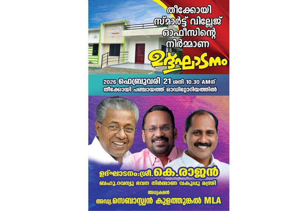 തീക്കോയി: തീക്കോയി സ്മാർട്ട്‌ വില്ലേജ് ഓഫീസ് പുതിയ കെട്ടിടത്തിന്റെ നിർമ്മാണോദ്ഘാടനം ഫെബ്രുവരി 21 ശനിയാഴ്ച രാവിലെ 10.30-ന് നടക്കും. തീക്കോയി ഗ്രാമപഞ്ചായത്ത്‌ കമ്മ്യൂണിറ്റി ഹാളിൽ നടക്കുന്ന ചടങ്ങിൽ റവന്യൂ-ഭവനനിർമ്മാണ വകുപ്പ് മന്ത്രി കെ. രാജൻ നിർമ്മാണോദ്ഘാടനം നിർവഹിക്കും.